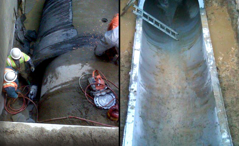 Success Story – G&F’s experience split-cutting large diameter concrete water pipes was invaluable in the cutting and removal of the 20′ top-half section of this project’s 72″ diameter pipe. Our skilled crews cut through the 8″-thick, metal-strapped, steel rebar-reinforced pipe walls to successfully lift and remove the section in one piece.